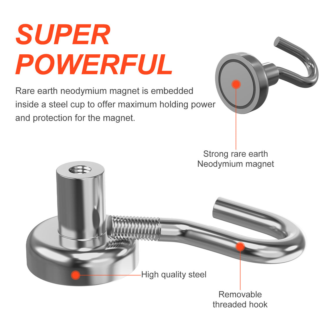 This handy and useful neodymium hook magnet as a strong neodymium magnet embedded inside a Nickel coated steel cup to offer the maximum gripping power. A Nickel coated hook is attached to the cup magnet through a M4 threaded hole. The steel cup offers protection for the magnet and concentrates the magnetic force on the magnet surface.
