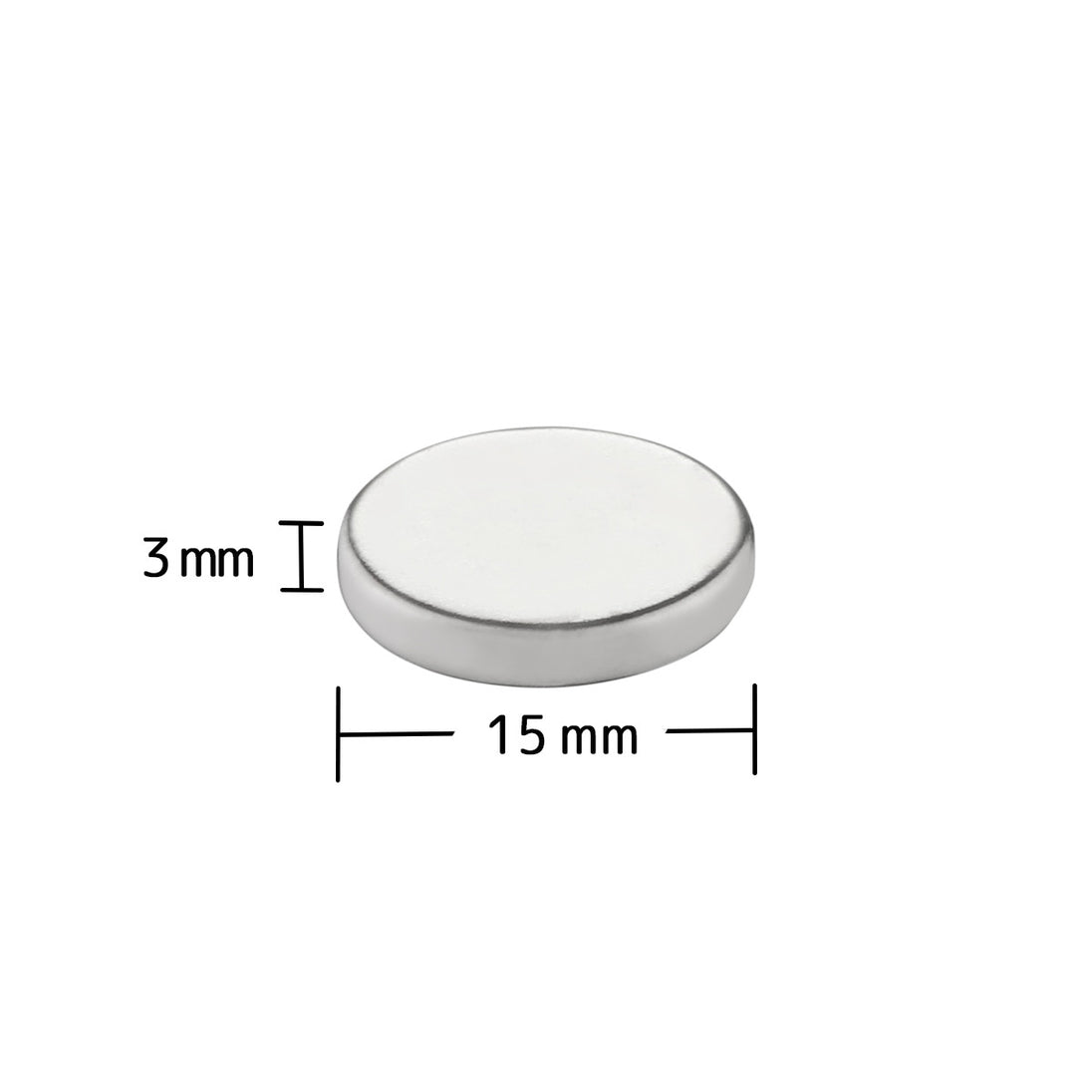 High-performance round magnets sized 15 mm x 3 mm (0.59" x 0.12"), offering exceptional hold strength for technical, educational, or creative uses.